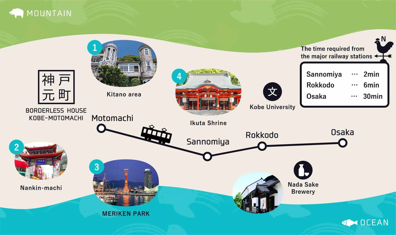 Borderless House Kobe-Motomachi offers excellent accessibility. It's just a 4-minute walk from JR/Hanshin Motomachi station and a 3-minute walk from Kobe Subway Kenchomae station. Sannomiya station is only a 15-minute walk away, making sightseeing and shopping effortless.