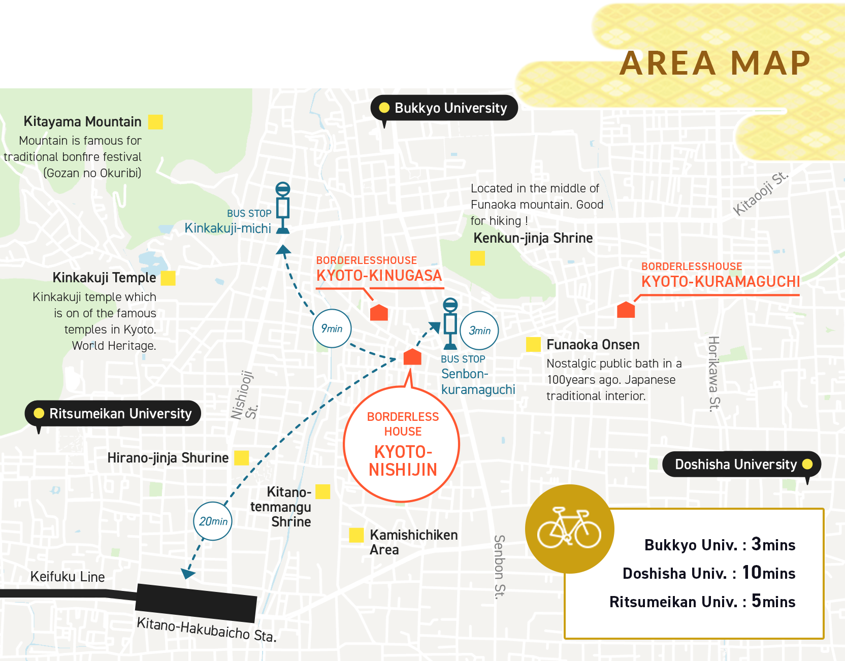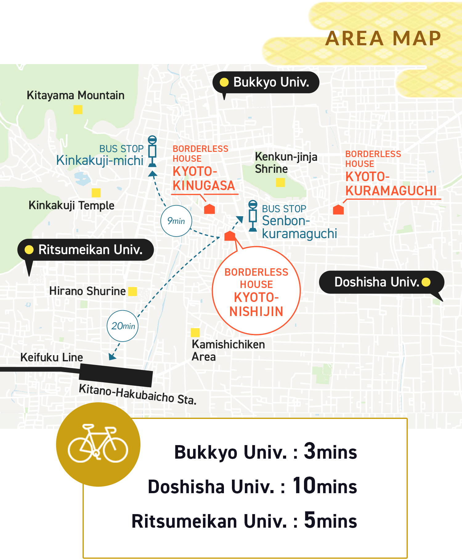 Located just 5 minutes by bicycle from Ritsumeikan University and 10 minutes from Doshisha University, Borderless House Kyoto-Nishijin is ideal for students. ISI Japanese Language School is also easily accessible by city bus without any transfers. Direct buses to Kawaramachi, Shijo, and Kyoto Station make it super convenient to explore the city.