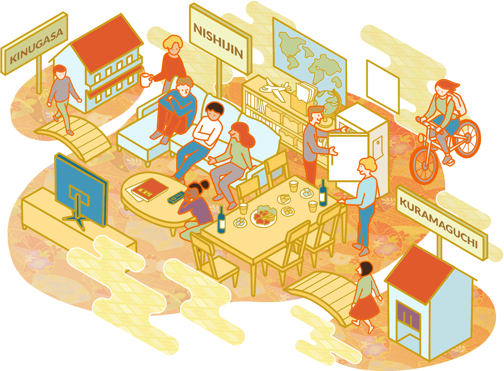 Enjoy living in a traditional Japanese neighborhood while experiencing a multicultural and multi-generational community at Borderless House Kyoto-Nishijin!