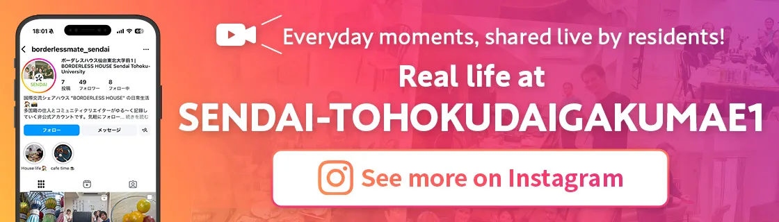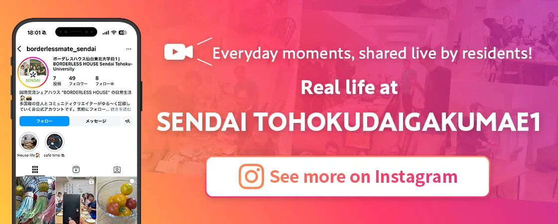Located in the charming Kawauchi area, just a short distance from Tohoku University, you’ll experience the best of both worlds: serene nature and vibrant city life. It’s a great spot to connect with diverse housemates, practice Japanese, and enjoy the slower pace of Sendai.